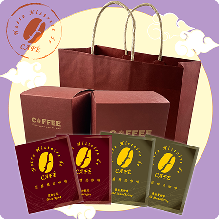 『Notre Histoire de Cafe...』(我們的咖啡故事)這個法文名稱,源自於我們對咖啡的熱愛。?確保品質及風味,由經驗老道的師傅親身操刀自家烘焙,嚴選咖啡分級,使用日式烘焙手法,堅持採用中小型烘焙機小量精緻烘焙,100%留住咖啡原始風味,小包裝是為了避免氧化過快,維持新鮮度,讓喝咖啡沒有壓力,也能讓顧客期待每一袋咖啡打開時的驚喜。 |