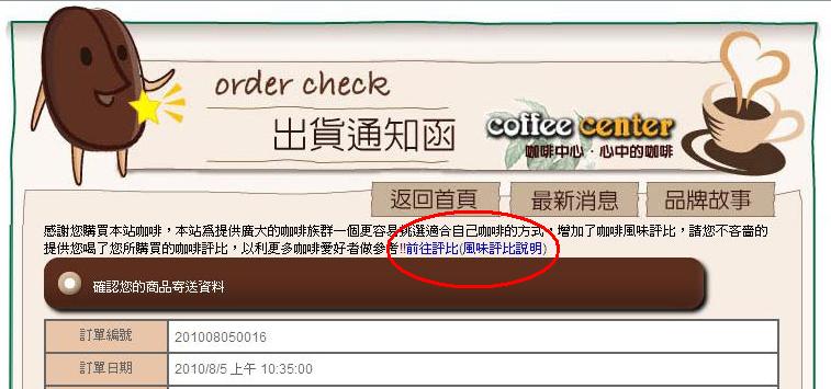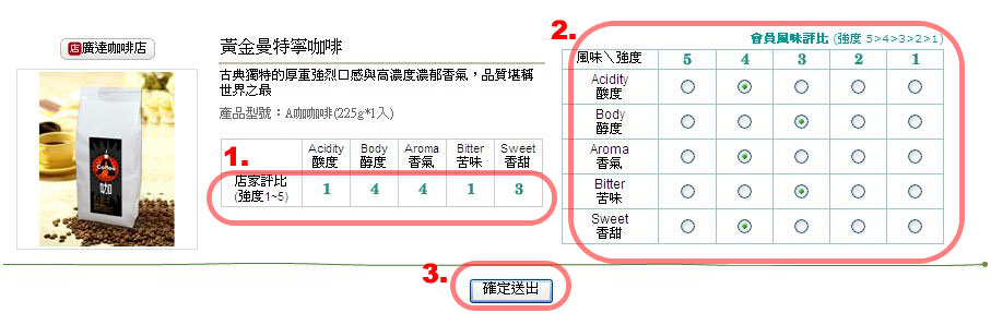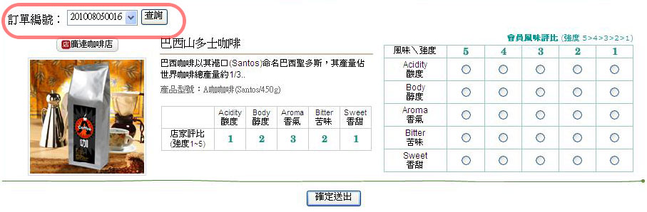 凡本站會員 2010/8/16 起 於本站購買咖啡豆一磅裝或半磅裝,當商品出貨後,會員在品嚐過購買的咖啡後,即可對該項咖啡豆商品進行風味評價!