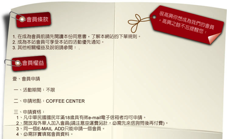 1、您可以選擇在COFFEE CENTER加入一般會員及企業會員,享有購物優惠價。